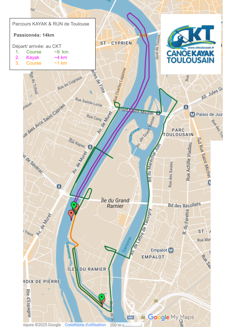 Pour le parcours Découverte, les 2 km de course à pied seront au frais sous les arbres de l'île du Ramier, pour arriver au niveau du ponton de l'aviron toulousain. De là vous embarquerez dans votre kayak 2 places (qui vous attendra avec gilets et pagaies) et partirez pour une jolie boucle de 4 km sur la Garonne jusqu'au niveau du Pont Saint Pierre. Sur le chemin vous pourrez alors admirer depuis l'eau : la prairie des filtres, le pont Neuf, les quais de la Daurade, le Dôme de la Grave, etc. L'arrivée du kayak sera sur le même ponton qu'à l'embarquement. Vous rejoindrez la terre ferme pour un sprint final de 1 km jusqu'à l'arche d'arrivée devant le CKToulousain ! 3 ravitaillements prévus : au km 2 (liquide + solide), au km 6 (liquide + solide) puis à l'arrivée.